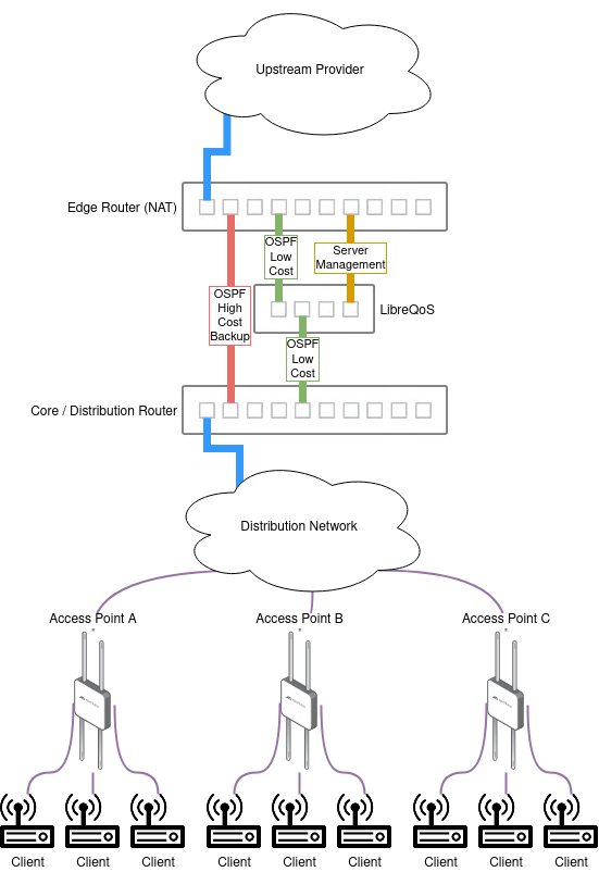 LibreQoS is an application that allows ISPs to apply bandwidth rate limiting to hundreds of clients using htb+cake or htb+fq_codel. Cake and fq_codel are Active Queue Management algorithms that reduce bufferbloat. When used in the context of an ISP network, these AQMs can be used when setting bandwidth limits on customer traffic - reducing latency, enforcing advertised plan bandwidth, and improving overall network performance. LibreQoS directs each customer's traffic into a hierarchy token bucket, where traffic can be shaped both by Access Point capacity and by the subscriber's allocated plan bandwidth. Please test to ensure compatability with your network architecture and design before deploying in production.