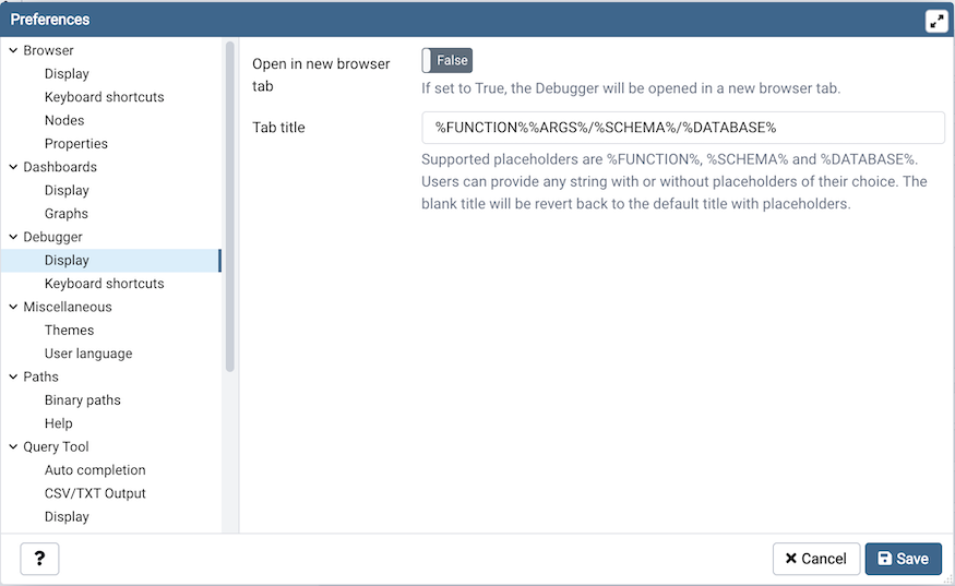 Added tab title placeholder for Query Tool, View/Edit Data, and Debugger.