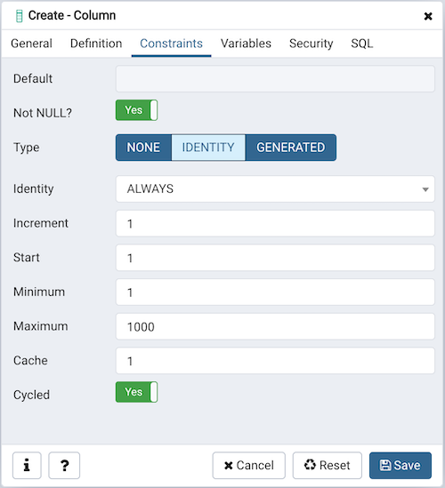 Ensure columns can be created when they are IDENTITY fields with the CYCLE option enabled. Fixes #4496 Ensure purely numeric comments can be saved on new columns. Fixed #4497